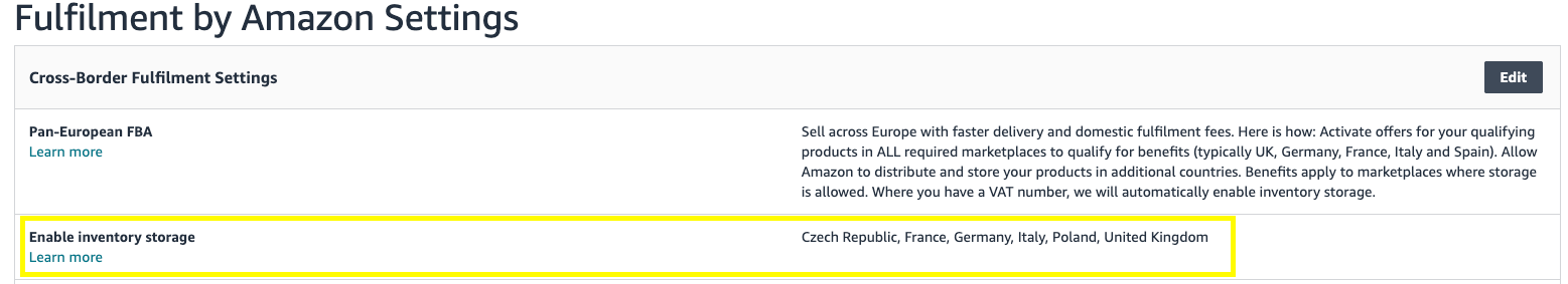Jděte do Nastavení (ozubené kolečko vpravo nahoře) - Fulfillment by Amazon (poslední položka). Zkontrolujte, kde nyní Amazonu umožňujete skladovat vaše zboží. Povolte pouze ty země, kde máte aktivní DIČ.