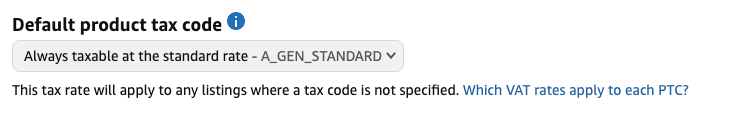 Tento kód určuje daňovou sazbu, kterou Amazon použije, když zalistujete nový produkt a nemáte ji pro daný produkt určenu. Pokud prodáváte zboží v různých daňových sazbách, doporučujeme nastavit A_GEN_STANDARD a zkontrolovat případně u každého produktu, kde eventuálně můžete nastavit správnou sazbu pro daný produkt. Pokud potřebujete najít správný Amazon daňový kód pro daný druh zboží, napište na naši podporu nebo si zarezervujte schůzku, kde s vámi náš pracovník nastavení projde. Pozor: Amazon běžně účtuje špatnou daňovou sazbu, pokud tomuto u produktů nebudete věnovat pozornost a nemáte toto nastaveno.